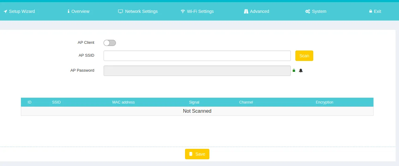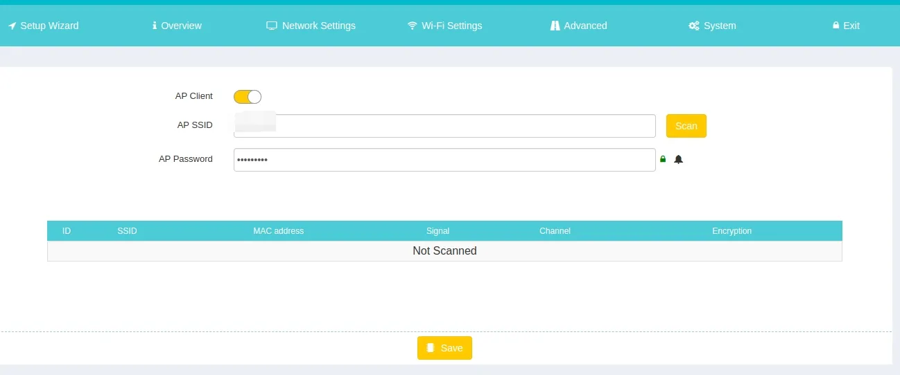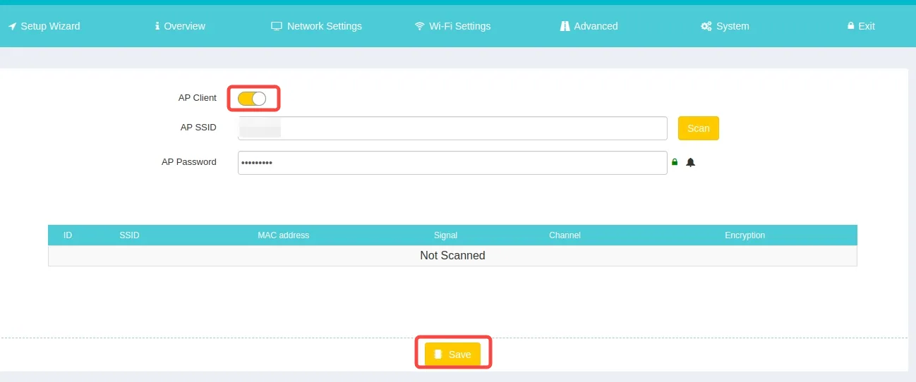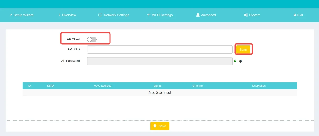 Turn on the "AP Client" switch and click "Scan" to start scanning.